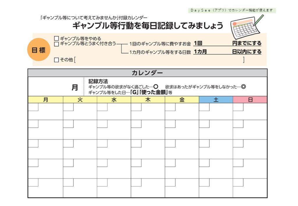 カレンダー「ギャンブル等行動を毎日記録してみましょう」