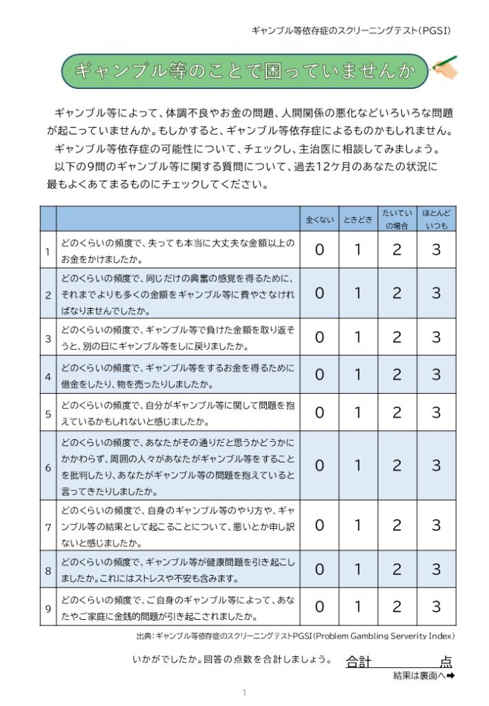 ギャンブル等スクリーニングテスト(PGSI)「ギャンブル等のことで困っていませんか」