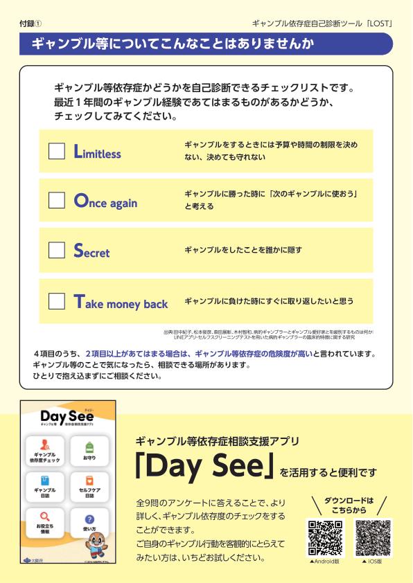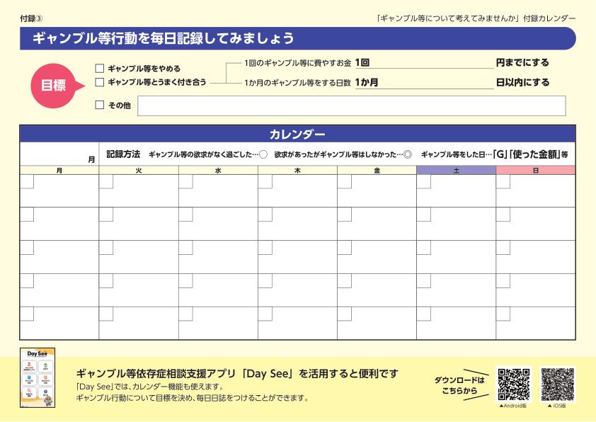 ※ ギャンブル等依存症の可能性を自己チェックできるスクリーニングツール(LOST・PGSI)や、カレンダー「ギャンブル等行動を毎日記録してみましょう」のみを、ダウンロードして活用することもできます。