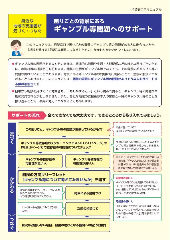 ※ 本マニュアルは、相談窓口用マニュアル「困りごとの背景にあるギャンブル等問題へのサポート」と、府民の方向けリーフレット「ギャンブル等について考えてみませんか」の2種類です。